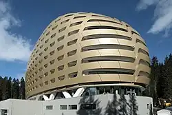 The AlpenGold Hotel, formerly branded as InterContinental, is a luxury hotel located in Davos, Switzerland.[1] Opened in 2013 to serve as a vacation and business resort in the Grison Alps, it was managed under the brand InterContinental until 2021, one of the world's major luxury hotel and resort brands. The building is known worldwide for its "golden egg" architecture;[2] it is the main hotel supporting the annual January meeting of the World Economic Forum (WEF) in Davos.