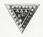 Alpha Delta Alpha's badge was a gold equilateral triangle, with one point down and a border of 21 pearls.[3] Inside the triangle was a black enamel triangle with a single pearl, a radio antenna, and the Greek letters ΑΔΑ.[3] Its pledge pin was a black triangle with a radio antenna and a white border.[3]
