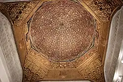 The fourth room had a coffered ceiling in worse condition than the previous ones, simpler in shape and details, and its lower frieze, with an ogival design, was not very wide, with painted bands rising above it and the pendentives in the angles to support the octagonal dome, which had no divisions and was decorated with geometric tracery.[2]