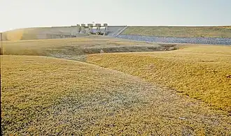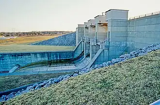 Alum Creek Dam was constructed between 1970 and 1974 on Alum Creek, a tributary of Big Walnut Creek, which drains into the Scioto River. The dam is a rolled earth-fill embankment 10,000 ft (3,000 m) in length with a maximum height of 93 ft (28 m). The spillway is located high on the right abutment with the raceway dropping off in front of it to the stilling basin below. Control is provided by three 34 ft (10 m) by 25 ft (7.6 m) tainter gates supported by 8 ft (2.4 m) wide concrete piers resting on concrete ogee sections. The ogee sections have a crest elevation of 878 feet (268 m) and are founded at 839 feet (256 m) elevation.