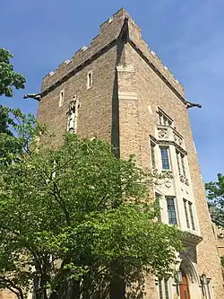 Both halls were designed in 1931 by architects Charles Donagh Maginnis and Timothy Walsh in Collegiate Gothic style.[12][13][14] The Maginnis & Walsh was known at the time for its innovative and refined gothic design of churches and campuses in Boston, and was behind the campus architecture of Boston College and the Basilica of the National Shrine of the Immaculate Conception.[15][16] The architectural style of both Dillon and Alumni was in line with the previous gothic building on campus by Kervick and Fagan such as Morrissey, with local yellow brick with limestone trimmings, adorned with stone carvings on the facade and the interiors.[5][2][4][17]