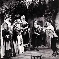 For its first three telecasts, the program had been presented in black-and-white (there were two presentations of it in 1952, one on Easter and one during the Christmas season),[8] but beginning in 1953, it was telecast in color.[9] Because it was an opera, and commercial network television executives had increasingly little confidence in presenting opera on television, it later began to be scheduled, with rare exceptions, as an afternoon television program, rather than shown in prime time as had been done in its first few telecasts.[10] According to The New Kobbe's Complete Opera Book, the first stage performance was presented at Indiana University Bloomington, on February 21, 1952,[11] with conductor Ernest Hoffman. The opera's second performance was in Boston on December 18 and 19, 1952. It was presented by the Opera Club at the Agassiz Theatre of Radcliffe College, under the direction of Thomas H. Phillips for the Longy School of Music. James Hercules Sutton, 9, soloist for Alfred Nash Patterson at the Church of the Advent, played Amahl; Claire Smith played the mother; Walter Lambert, Paul Johnson and Hermann Gantt played the three kings.
