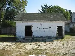 Located on the property of Ambler's Texaco Gas Station, just north of the station, is a 24-foot (7.3 m) by 16 foot (4.9 m) wood clad, wooden frame building that once housed a commercial icehouse. Though its exact dates of operation are unknown, it is believed the icehouse was established by a member of Jack Schore's family during the 1930s. While the icehouse was in business, there was a small pond located about 200 feet (61 m) east of the property. Operators cut ice from the pond and stored it in the building until sale. After the icehouse ceased operation, a date that is also unknown, the building was used as a storage shed for the gas station. The building features a double wall with sawdust stuffed in between the walls to provide insulation. The wooden roof has asphalt shingles. Ambler's Texaco Station listing on the National Register lists the icehouse building as a contributing property.[3]