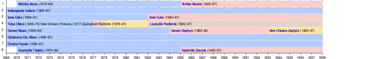 With major league expansion in 1969 and the need for four new Triple-A farm teams, the American Association was revived. The creation of a third Triple-A league would alleviate some of the travel costs incurred by having only two leagues spread out across the country.[27] The new American Association would field six teams in 1969. It re-acquired its old Indianapolis; Denver, Colorado; and Oklahoma City, Oklahoma, territories from the PCL, revived the Omaha, Nebraska, franchise, and added two cities (Des Moines, Iowa, and Tulsa, Oklahoma) that were new to the circuit. The teams played a 140-game schedule with no All-Star Game or playoffs.[28] In 1970, the AA returned to a two-division format, reintroduced the All-Star Game and playoffs, and expanded to eight cities with the addition of Wichita, Kansas, and Evansville, Indiana.[29]