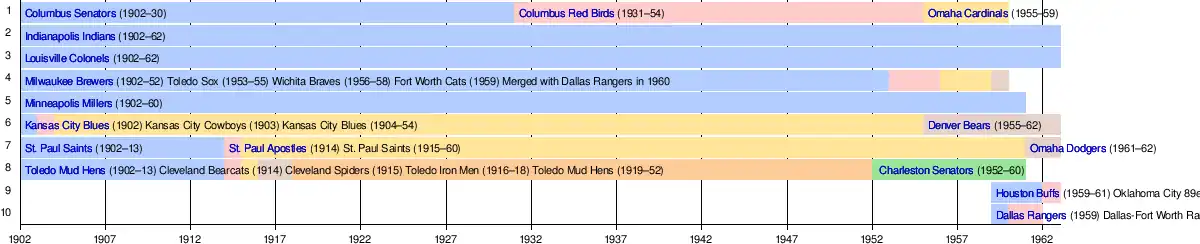 After the 1962 season, the American Association disbanded, and some of its member teams were distributed between the Pacific Coast League (PCL) and the International League (IL), while others (the Louisville Colonels and Omaha Dodgers) folded altogether. The Indianapolis Indians joined the IL, and the Dallas-Fort Worth Rangers, Denver Bears, and Oklahoma City 89ers went to the PCL.[26]