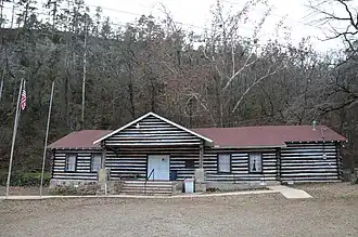 The American Legion Post No. 121 is a historic social hall on Legion Hut Road in southern Paris, Arkansas. It is a single-story L-shaped structure, built out of notched logs on a stone foundation. The logs are painted brown, and are mortared with white cement. It has a gabled roof with exposed rafter ends. A gabled porch shelters the front entrance, supported by square posts set on concrete piers faced in stone. The building was constructed in 1934 with work crews funded by the Works Progress Administration, and is the best local example of WPA Rustic architecture.[2]