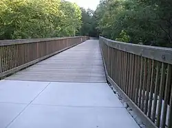 The American Tobacco Trail runs through the city of Durham south to the Chatham county line, crossing over I-40 near The Streets at Southpoint mall. A pedestrian bridge was erected over I-40 in April 2013, connecting the northern and southern segments of the Durham County portion of the trail, but due to construction errors, did not open until February 2014. This segment of the ATT within Durham County is a designated portion of the East Coast Greenway.[2][3]