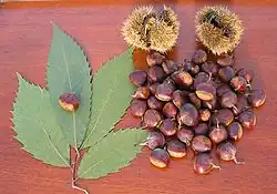 - ^ Santos C, Nelson CD, Zhebentyayeva T, Machado H, Gomes-Laranjo J, Costa RL (2017). "First interspecific genetic linkage map for Castanea sativa x Castanea crenata revealed QTLs for resistance to Phytophthora cinnamomi". PLOS ONE. 12 (9): e0184381. Bibcode:2017PLoSO..1284381S. doi:10.1371/journal.pone.0184381. PMC 5589223. PMID 28880954.