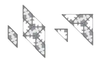 Amman's A and B tiles in his pair A5 are a 45-135-degree silver rhombus and a 45-45-90 degree triangle, decorated with matching rules that allowed only certain arrangements in each region, forcing the non-periodic, hierarchical, and quasiperiodic structures of each of the infinite number of individual Ammann–Beenker tilings.
