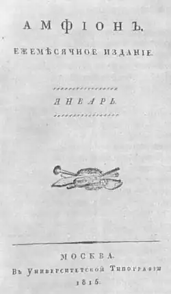 Amphion (Russian: Амфион, pre-1917: Амфiонъ) was a Russian monthly literary magazine published in Moscow in 1815. Prose was but a small part of its output; what prevailed in its pages were odes, fables in verse, elegies and translations of classics like Horace, Titus Livius and Lucian. It was the first Russian magazine where serious critical analysis of poetry, prose, drama and theatre productions started to feature on a regular basis.[1] The central figure in producing Amphion was its editor-in-chief and co-publisher (alongside with S. Smirnov and Fyodor Ivanov), the poet and literary critic Alexey Merzlyakov (who also went down in history as the young Mikhail Lermontov's personal tutor). Merzlyakov's in-depth analysis of Kheraskov's Rossiyada (serialized in Nos. 1–3, 5–6, 8—9), which is considered to be the first work of literary criticism in Russia, had a strong formative influence on Russian literary scene of the time.[1]