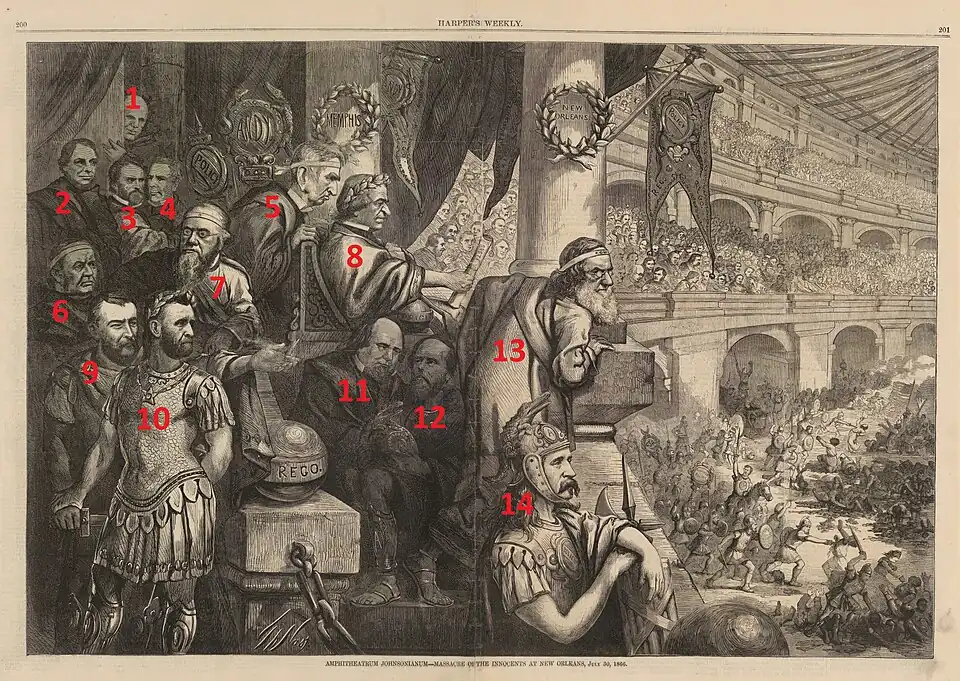 - ^ "Amphitheatrum Johnsonianum – Massacre of the Innocents at New Orleans – July 30, 1866". Harper's Weekly. Vol. XI, no. 535. March 20, 1867. pp. 200–201 – via Internet Archive.