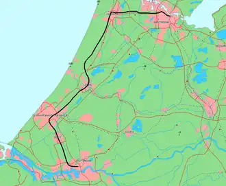 It contains the oldest railway line in the Netherlands, and follows the old horse-drawn boat (Dutch: trekschuit) canal route from Leiden via Haarlem to Amsterdam-Sloterdijk. It was opened between 1839 and 1847 by the Hollandsche IJzeren Spoorweg-Maatschappij. The oldest section, opened in 1839, ran from Amsterdam to Haarlem. Leiden and The Hague were reached in 1843, and the final section from The Hague to Rotterdam was opened in June 1847.[1]