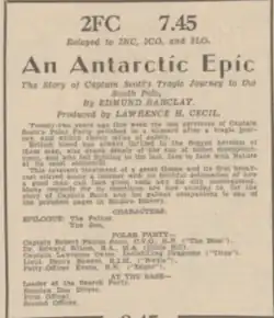- ^ Australian Broadcasting Commission. (22 February 1947), "Saturday Night Drama – Antarctic Epic Attracted Many Excellent Criticisms – "Moving Piece of Writing"", ABC Weekly, 9 (8), Sydney: ABC, nla.obj-1377471400, retrieved 31 August 2023 – via Trove