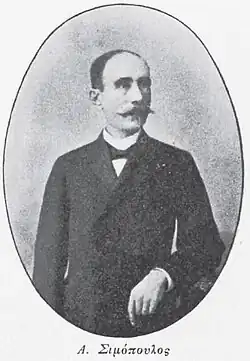 Anargyros Simopoulos was born in 1837 in Parnassida.[3] He was first elected MP in his hometown in 1882. Simopoulos served as Minister of Justice in the government of Charilaos Trikoupis (1892-1893). In 1897 he participated in the government of Dimitrios Rallis taking over the Ministry of Finance.[4] He held the same position in the government of Georgios Theotokis : in the first term for two years 1899–1901, in the second term in 1903, in the third term for a subsequent two years 1903-1904 and in the last term from 1905 to 1908.[1][5] Simopoulos had served as deputy governor of the National Bank.