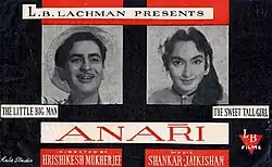 Anari is a 1959 Indian Hindi-language comedy film directed by Hrishikesh Mukherjee. The film stars Raj Kapoor, Nutan, Motilal and Lalita Pawar. The music was by Shankar Jaikishan and the lyrics by Hasrat Jaipuri and Shailendra. This was among the few films in which Lalita Pawar played a positive role and Motilal a role with shades of grey. The film was remade in Tamil as Pasamum Nesamum (1964) and in Turkish as Derbeder (1960), Enayi (1974).[1]