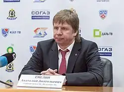 Anatoly Anatolevich Emelin (Russian: Анатолий Анатольевич Емелин, Anatoliy Yemelin); (born October 3, 1964) is a former Russian ice hockey player. He played right winger and scored 229 goals in 596 official games. After 1997-98 season, Emelin finished his player career and became a coach in HC Lada Togliatti. In 2006, he was promoted to head coach of the team.