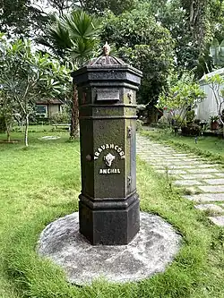 These pillar boxes are made of cast iron, are about 100 cm tall and hexagonal in shape. The letter box features the State emblem, the Shankha. A pair of smaller Shankha are seen on either side of the mail slot. The words Travancore Anchal, Anchal letter box, letters taken are embossed and at the centre of the box is a Shankha emblem. Also it shows what time the letter is cleared out from the box. These letter boxes, each weighing about 715 kilograms, could take about 3000 letters and small packets. The manufacturer's name, Massey & Co, Madras is embossed on them.[7]