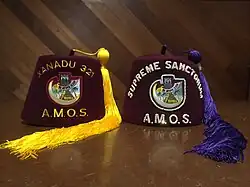 The regalia of AMOS is a fez with the emblem of the group in the center, a pyramid with the names "Xerxes" and "AMOS" inscribed on it, surrounded by palm trees. Below the pyramid is a crescent moon and above it is an owl perched on a scimitar inscribed with "We Never Sleep," the motto of the Order. Below the logo are the letters "A.M.O.S." and above it is the name of the wearer's sanctorum, Division, or "Supreme Sanctorum," depending on the rank of the member. AMOS possesses a more complex series of fez and tassel colors than most fez-wearing fraternal organizations with the following different fez and tassel color combinations used:[10][12]