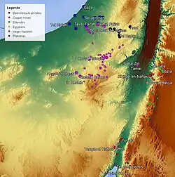 The Egyptians operated a copper mine in the Timna Valley, as evidenced by a Hathor temple from that period.[33] After the Egyptians withdrew, another group took over the copper mine. This group also constructed a fortress-like road station at the Yotvata oasis, notably using the casemate building technique,[34][35] and established another copper mine at Khirbet en-Nahas.[36]