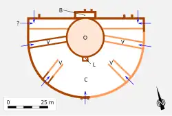 The cavea, shaped like a horseshoe arch, has a diameter of 66 meters. The orchestra, in the shape of a horseshoe, has a diameter of 25 meters, while the narrow proscenium measures 19 meters in width. These characteristics classify the Alauna theater among Gallo-Roman amphitheaters, which were mixed-purpose structures capable of hosting various shows, with circus games in the orchestra and theatrical performances on the stage. The height differential between the summit of the cavea and the stage is estimated to be approximately eight meters.[28][29] Five vomitoria, whose walls were initially erroneously identified by Bernard de Montfaucon as "ten staircases [...] arranged in pairs, in parallel lines," provide access to all seating areas, from the peripheral wall to the orchestra.[30] At least two precinctions demarcate the boundaries of the cavea.[31]