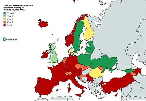 During the Parliamentary Assembly of the Council of Europe (PACE) session held from June 24 to 28, 2019, the Republic of Moldova was represented by delegates Andrei Năstase of Platforma DA, Vlad Batrîncea of the Socialist Party (PSRM), and Mihai Popșoi of the Party of Action and Solidarity (PAS).[36] The assembly was poised to deliberate on restoring Russia's membership, which had been suspended following the 2014 annexation of Crimea. Moldovan representatives Năstase and Batrîncea both voted in favor to reinstate Russia to the human rights body,[37] a move that saw substantial backing from a majority of European countries including Germany and France.[38]