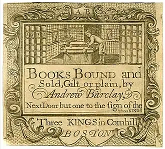 Barclay's first bookbinding shop was located in Cornhill, Boston, where other printers and book sellers had established themselves. In colonial America, bookbinders were an obscure group of tradesmen who rarely took official credit on the title page of the works they bound. Because of limited resources, with virtually no patronage from royalty or wealth, with little access to superior sources of materials, along with the unstable and wavering economic and political factors present in the colonies, their work was generally of average quality compared to that of European bookbinders.[9] Very often they combined the business of bookbinding with bookselling and sometimes with printing and publishing. There is no known bookbinder of American origin that was known to sign or label the works he bound. The two exceptions in the American colonies both emigrated from Scotland; Andrew Barclay and Samuel Taylor, who worked out of Boston and Philadelphia respectively.[10][11]