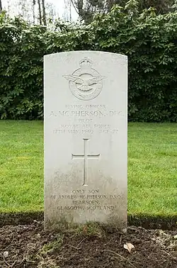 McPherson was killed on 12 May 1940 when his Blenheim was shot down by German Messerschmitt Bf 109 fighters near Lanaken, Belgium, while on a mission to bomb armoured columns. This was the same action that earned Donald Garland and Thomas Gray posthumous Victoria Crosses.[4][5] McPherson is buried at the Heverlee Commonwealth War Graves Commission Cemetery in Leuven, Belgium.[1]