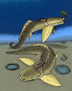 Angarichthys hyperboreus is an extinct homostiid arthrodire placoderm from the Middle Devonian (either upper Eifelian or lower Givetian) of Siberia.[1] It is known from an infragnathal plate, an intero-lateral plate, and a marginal plate found from the Middle Devonian strata of the Tynep Series formation, in the Bakhta River basin, Tunguska Plateau. A. hyperboreus differs from Homosteus in that the former's marginal plate has a ridge where the central plate would have overlapped it,[1] and in the infragnathal, which is curved sigmoidally, and bears at least seven tooth-like prongs nearer to the functional anterior end (the plate, which is fragmentary, suggests that the intact plate would have borne several more).[1]