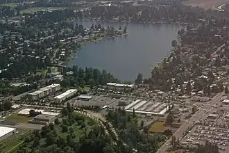 Angle Lake is an L-shaped lake in SeaTac, Washington, United States, occupying 102 acres (0.41 km2) between Interstate 5 and State Route 99. The lake most likely was so named on account of its outline, which forms a right angle.[2] Like nearby Lake Burien and Bow Lake, it was formed by the glacial retreat roughly 12,000 years ago.[3]