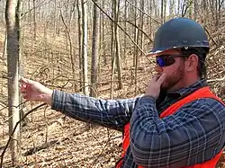 An angle gauge is a tool used by foresters to determine which trees to measure when using a variable radius plot design in forest inventory. Using this tool a forester can quickly measure the trees that are in or out of the plot. An angle gauge is similar to a wedge prism though it must be held a fixed distance from the eye to work properly. Unlike the wedge prism, which is held over the plot center, the surveyor's eye is kept over plot-center when using an angle gauge.