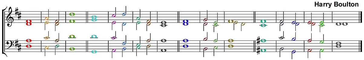 Below are the four lines of the doxology Gloria Patri (commonly known as the "Gloria"), with the text coloured to show which words correspond to which notes in the music (pointing varies from choir to choir):