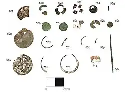 Brooches of the tenth and eleventh centuries are typically circular.[8] The most opulent brooches are silver, others are base metal. Small, round brooches, worn as cloak fasteners, are often depicted on men in late Anglo-Saxon art. Other brooch types which have been uncovered in late Anglo-Saxon burial finds are not seen in Anglo-Saxon art during this time period.[66]