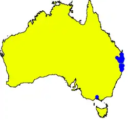 Smudgee grows in sandy soil on sandstone hills in forest from Tin Can Bay in Queensland to Coffs Harbour in New South Wales and sporadically on the Darling Downs.[2][3]