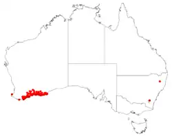 The plant is often situated in seasonally wet areas growing in sandy soils along the south coast from around Albany in the west to around Cape Arid in the east.[2]