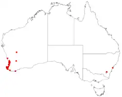 It is found along the west coast from around Gingin in the north down to around Augusta in the south where it is commonly situated in damp or areas that are wet in winter growing in clay, loam or sandy soils.