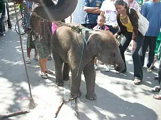 Baby elephants are taken from the wild, with the adult elephants around the baby killed.[8] The elephants are then often put through a process of beatings to "mentally break" them, to make them submissive for the lucrative entertainment of tourists in tourist parks.[8][9]