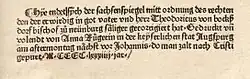 Hye endet sich der sachsenspiegel mitt ordnung des rechten den der erwirdig in got vater und herr Theodoricus von bockßdorf bischof zu neünburg säliger gecorrigieret hat. Gedruckt und volendt von Anna Rügerin in der keyserlichen stat Augspurg am aftermontag nächst vor Johannis. do man zalt nach Cristi gepurt/M.CCCC.lxxxiiij.jar./