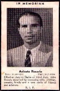Dadra had a total of three police officers to maintain law and security in the region. The UFG, led by Francis Mascarenhas, Viman Sardesai and others, attacked the police station of Dadra on the night of 22 July 1954, assassinating Aniceto Rosário, an inspector at Dadra Police Station. There were two other police officers in the police station, who were overpowered by the UFG forces.[7] The next morning, an Indian flag was hoisted to declare Dadra a free territory. A gram panchayat for Dadra was formed under the administration of Jayanti Bhai Desai.[2]