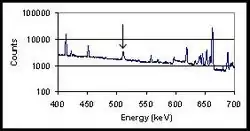 Annihilation radiation is not monoenergetic, unlike gamma rays produced by radioactive decay. The production mechanism of annihilation radiation introduces Doppler broadening.[2] The annihilation peak produced in a photon spectrum by annihilation radiation therefore has a higher full width at half maximum (FWHM) than decay-generated gamma rays in spectrum. The difference is more apparent with high resolution detectors, such as Germanium detectors, than with low resolution detectors such as Sodium iodide detectors.
