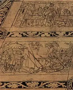 The decoration of the temple is naturally all derived from the Old Testament, but the subjects shown are those believed in the Middle Ages to prefigure the coming of Christ the Messiah. In the floor tiles David's slaying of Goliath (centre front) foretells Christ's triumph over the devil. Behind this, Samson pulls down the Temple of the Philistines, prefiguring both the Crucifixion and the Last Judgement, according to medieval authorities. To the left, Delilah is cutting Samson's hair (Betrayal of Christ), and behind he slays the Philistines (Christ's triumph over sin). The death of Absalom and possibly that of Abimelech are identified by some art historians, although only tiny sections are visible. Erwin Panofsky, who developed much of this analysis, proposed a scheme for the significance of the astrological symbols in the round border tiles, and other versions have been suggested.[10] Gabriel appears to be placed over the sign of Aries, the sign for the time of the Annunciation. The Virgin Mary stands over her own sign, Virgo.[11]