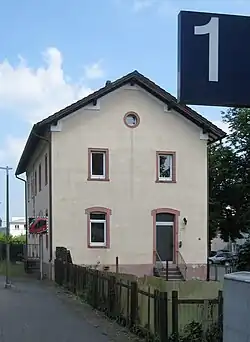 The entrance building was built in the neoclassical style for the commissioning of the station in 1874. It is protected under the Rhineland Palatinate Conservation Act. In its execution it was almost identical with its original counterpart at Biebermühle station (now Pirmasens Nord station).[18] The front-gabled central section of the building has three floors. Two two-storey wings are attached to it. The platform canopy was completed a few years after the station was opened.[19] Similar buildings were found on the lines of the Palatinate Railways (Pfälzische Eisenbahnen) as well as the stations of Enkenbach, Kirchheimbolanden, Langmeil and Marnheim.[20]