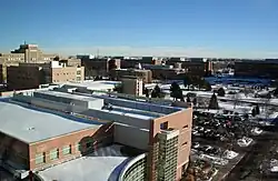 The Anschutz campus hosts administrative and teaching functions, as well as clinical and research programs with nearly 25,000 faculty, employees, and support staff.[44] The principal buildings on campus include the Fitzsimons Building (formerly Building 500), two Research Complex towers, two education buildings, the Fulginiti Pavilion for Bioethics and Humanities, the Barbara Davis Diabetes Center, the Nighthorse Campbell Native Health Building, Strauss Health Sciences Library, the Anschutz Health and Wellness Center, as well as the individual buildings for the Skaggs School of Pharmacy and Pharmaceutical Sciences, and the School of Dental Medicine. The Children's Hospital and the University of Colorado Hospital are located to the south of the campus.[45] The north part of campus consists of two bioscience buildings, which includes the Gates Biomanufacturing Facility.[46] The campus is served by two stations on the RTD R Line, Fitzsimons station and Colfax station.