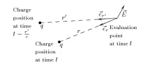 - is the distance from the observation point (the place where is evaluated) to the point where the charge was seconds before the time when the measure is done.