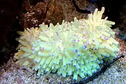 Discosoma sp. | Large, solitary polyps similar to sea anemones, but with stumpy columns and large oral discs with many short tentacles. Catch large prey and some species zooxanthellate.[4] | On coral reefs, mostly tropical.[4] | |