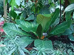 Anthurium hookeri, commonly called a bird's nest anthurium, is a species of flowering plant in the genus Anthurium.[1] Anthurium hookeri possesses some unique features which include, short internodes, dense roots, and lanceolate cataphylls. The leaves have triangular to D-shaped petioles 2โ9 cm long, are rosulate, 10โ26 cm wide, 35โ89 cm long. The leaves exhibit a scalariforme venation and supervolute vernation. Covering the leaves are tiny black glandular punctuates. The berries produced by the plant are white.