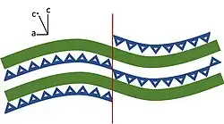 The magnesian serpentines (antigorite, lizardite, chrysotile) are trioctahedral hydrous phyllosilicates. Their structure is based on 1:1 octahedral-tetrahedral layer structures. Antigorite is monoclinic in the space group Pm.[13] Although the magnesian serpentines have similar compositions, they have significantly different crystallographic structures, which are dependent on how the SiO4 tetrahedra sheets fit in with the octahedral sheets.[14] Antigorite's basic composition has a smaller ratio of octahedral to tetrahedral cations (relative to lizardite and chrysotile),[15] allowing the structure to compensate for the misfit of sheets through periodic flipping of the curved tetrahedra layers, and subsequently their polarity.[16] Polysomes of antigorite are defined by the number of individual tetrahedra (denoted as the value m) which span a wavelength of the direction of curvature.[17] The sheets of tetrahedra allow the platy, fibrous crystals to separate parallel to the 001 (basal) plane, giving antigorite its perfect cleavage.