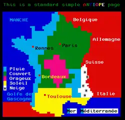 Antiope was based on a 40 × 25 character grid using ISO 646 and ISO 2022, with support for accented letters.[8] A fundamental difference in technical philosophy between Antiope and the Ceefax teletext system developed by the BBC stemmed from the fact that Antiope was developed by telecommunications engineers, while Ceefax was developed by television engineers. The television engineers created a system which filled the screen with data at a fixed, predictable rate; in contrast Antiope was constructed like a packet-switching system, with variable length packets of data, as might be used on a telephone network.