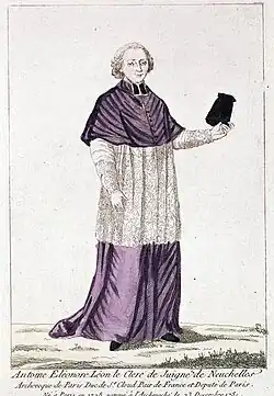 Antoine-Éléonor-Léon Leclerc de Juigné (2 November 1728 – 19 March 1811) was a French Catholic prelate and politician who served as Archbishop of Paris from 1782 to 1802. He was elected deputy of the clergy to the Estates General of 1789.