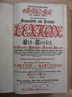 La Martinière's main work is the 10 volume Grand Dictionnaire Geographique Et Critique, of which the first volume appeared in 1726 in the Hague. It is one of the most extensive geographical works of the 18th Century. On the advice of the Marquis Beretti Landi, Ambassador of Spain to the States-General of the Netherlands, La Martinière dedicated the work to the Spanish King Philip V. In Germany, the work was translated and expanded under the title Historical and Political-Geographic Atlas of the whole world. The alphabetical volumes of the German edition were published in 1744–1749, and a supplementary volume in 1750. The publisher was Johann Samuel Heinsius of Leipzig, but the translation and expansion project was initiated by his partner Johann Heinrich Zedler. The Grand Dictionnaire Geographique Et Critique was published in several editions after La Martinière's death, such as a six-volume revised edition in Paris in 1768.