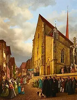 When he was sixteen, he went to the Academy of Fine Arts Munich; copying the Dutch Masters and working as an assistant to Peter von Cornelius. In 1840, he settled in Lucerne, where his family had moved the year before, and set up a studio. In 1844, he was commissioned to decorate the Grand Council Chamber. He also painted some altarpieces. In 1848, he left Lucerne for further studies. Some sources say he returned to Munich, others that he went to the Kunstakademie Düsseldorf and worked under the direction of Friedrich Wilhelm von Schadow.